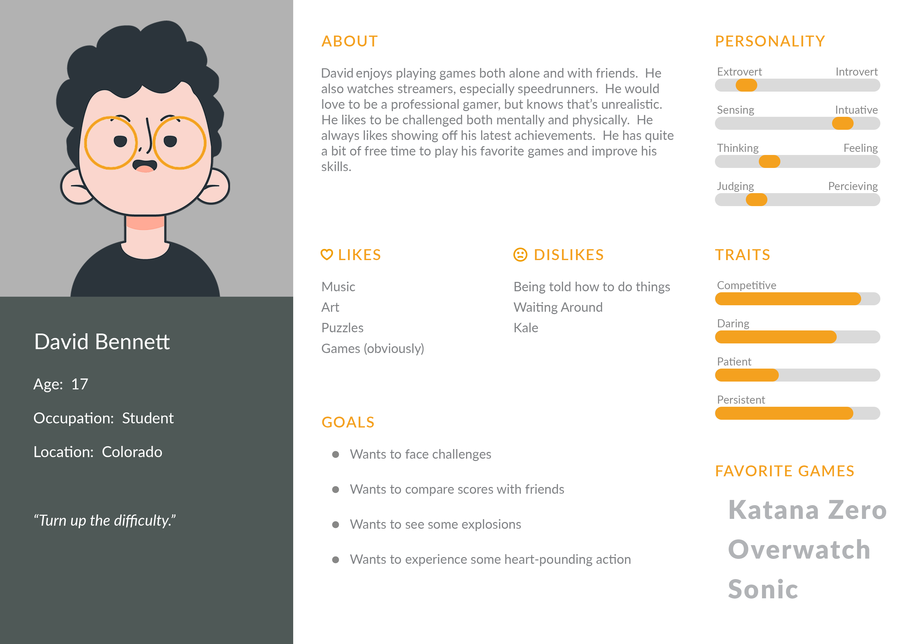 Our game originally aimed to please two groups of players. The first were puzzle game enthusiasts, like Mollie, looking for a mentally challenging experience. The second audience was fans of speedrunning and action, like David. As a result, our game ended up being two games mashed into one. This of course would cause major issues later down the line, but we were blissfully unaware of them at the beginning of our development.