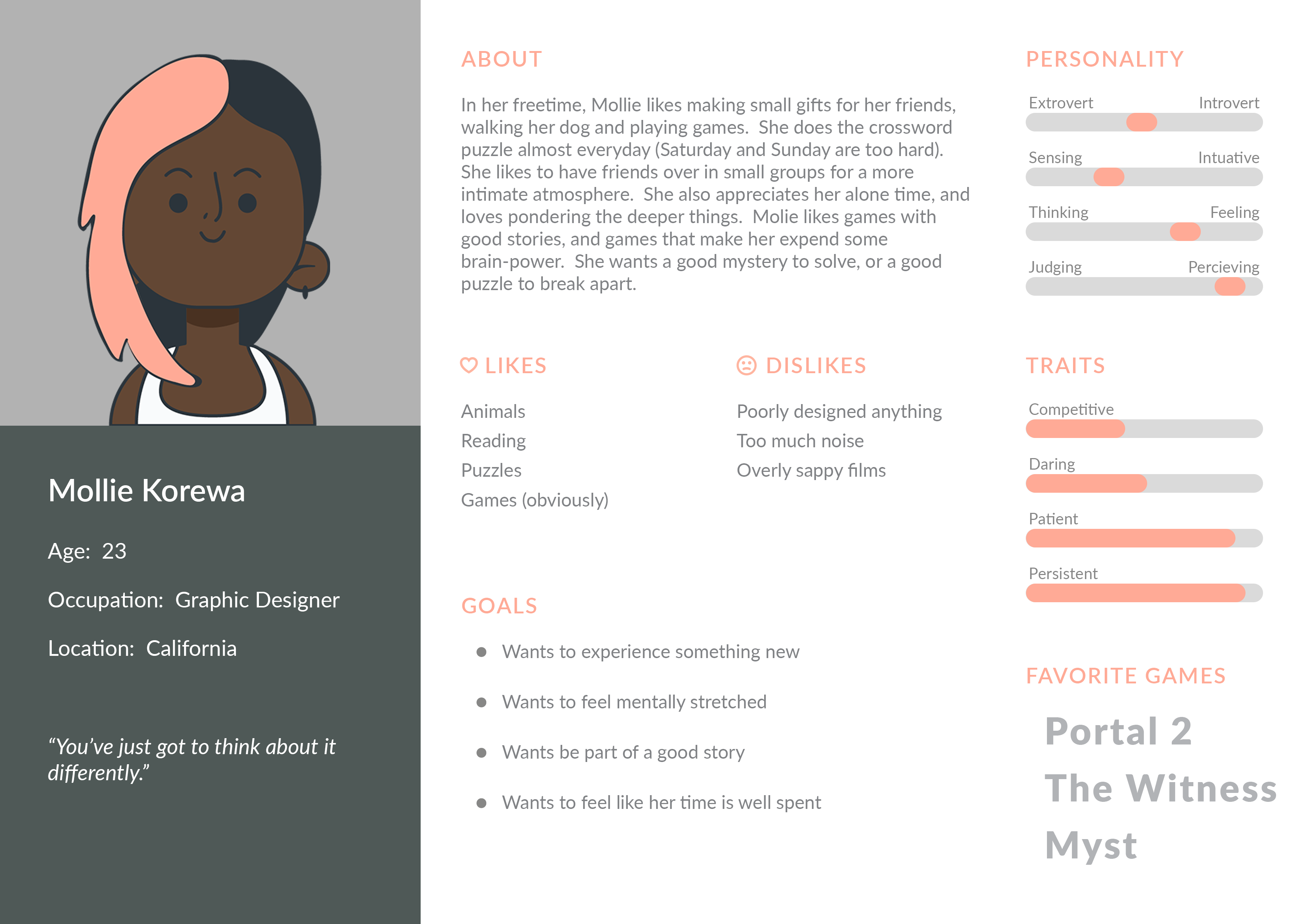 For this project I took the lead in team decisions concerning game design.