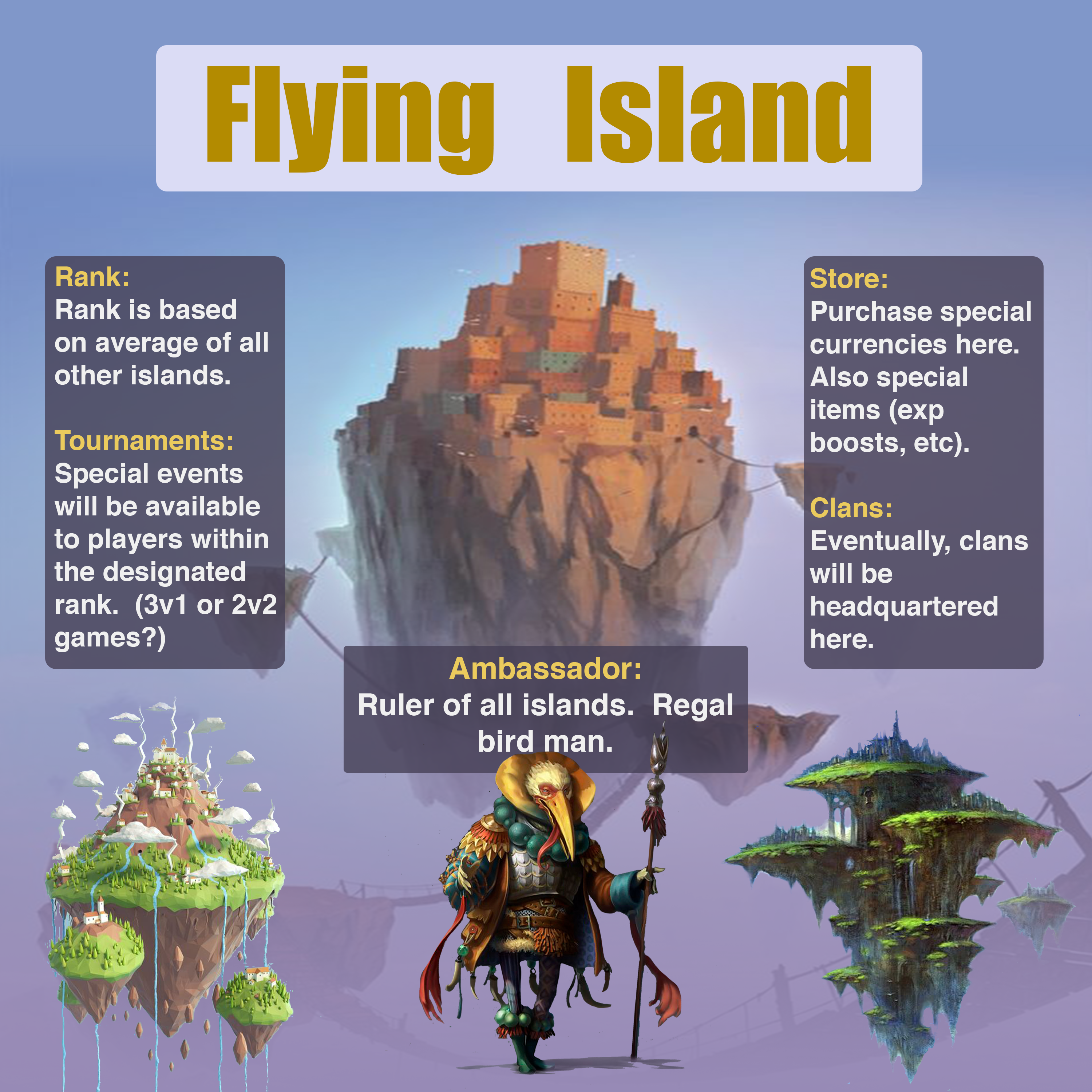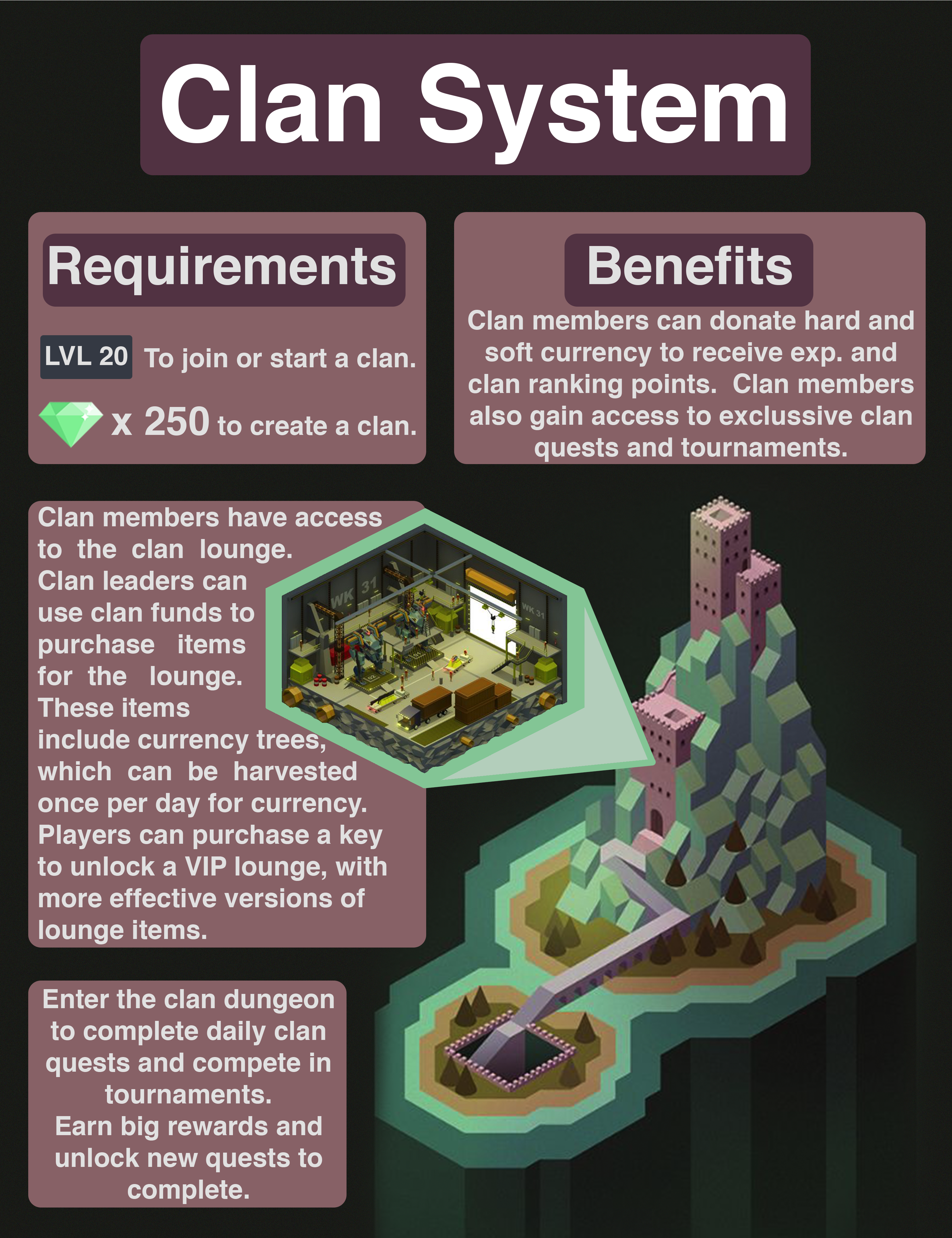 I also created a very rough outline of a possible clan system. This system was inspired by games like Kingdom of Loathing and Clash of Clans. Clans would provide a place for players to connect with each other. A clan would also provide players with a rewarding use for their various currencies.
