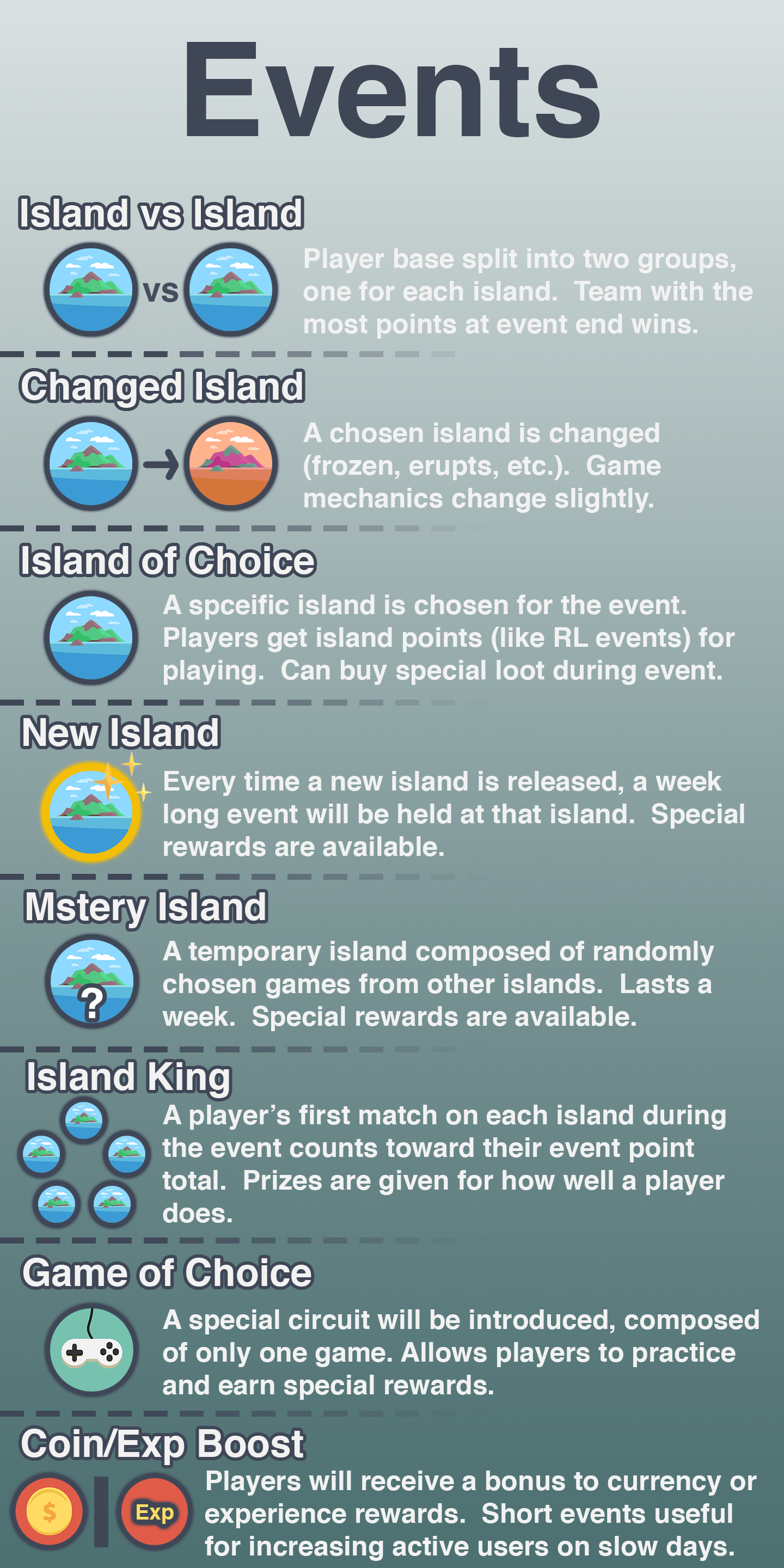 I also had the opportunity to work on designing a list of possible events to keep our players engaged post-launch.