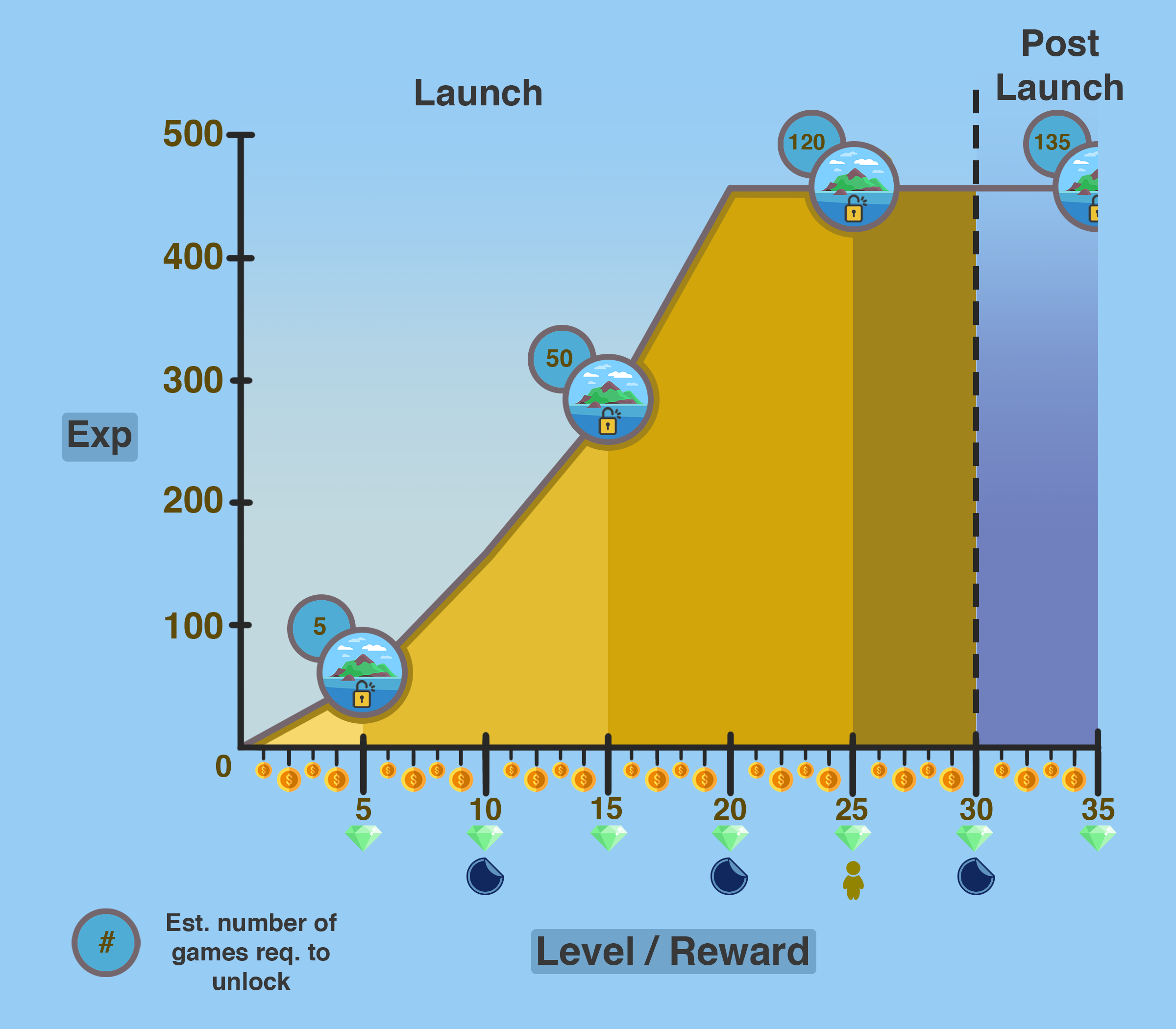 I was tasked with helping to design the first pass of our XP, leveling and reward system. The main challenge of designing this part of our game was trying to balance the time it would take to level up with the reward of leveling up. We wanted to keep players invested, but wanted to avoid forcing players to grind for rewards, or move up the reward ladder too easily. After starting with a base XP-reward, it was simple to calculate the amount of time needed to reach a certain level. After looking at games such as Clash Royal and Overwatch, we decided on a leveling curve that seemed to strike the right balance. We then placed rewards along that scale that would keep players coming back to our game regularly. We also designed our scale to provide players with an exciting and rewarding first play session. The action starts right when a player first opens our app. Below you can see the result of this first design pass.